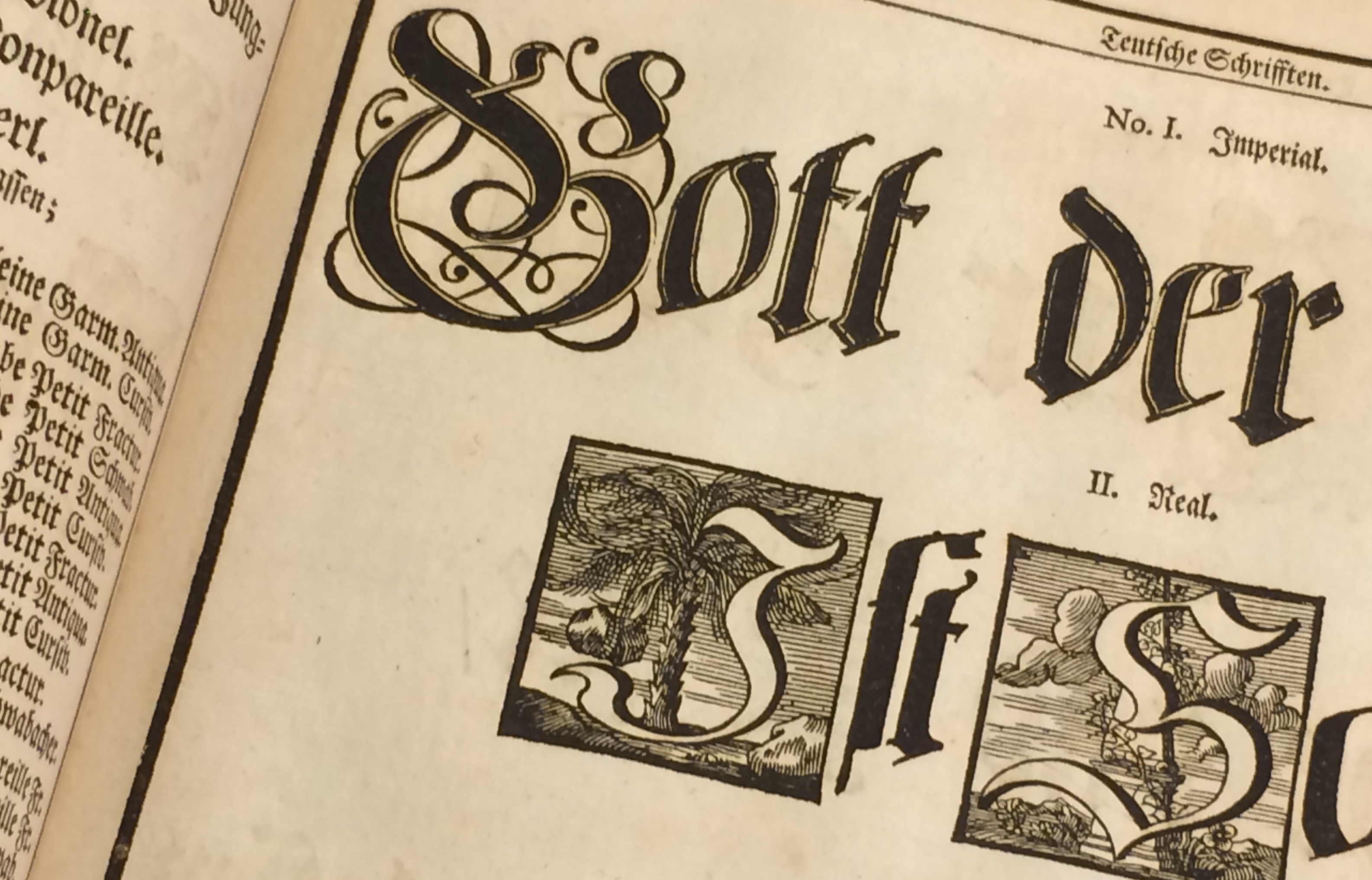 Archival adventures continue in RIT’s Cary Collection. Johann Ernesti’s 1721 printer’s manual (catalog record here) included 44 pages of typographic specimens, including alphabets in Hebrew, Greek, and Arabic. This Imperial-sized* German blackletter with its decorative capital seemed worthy of a close-up.